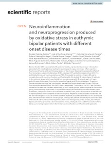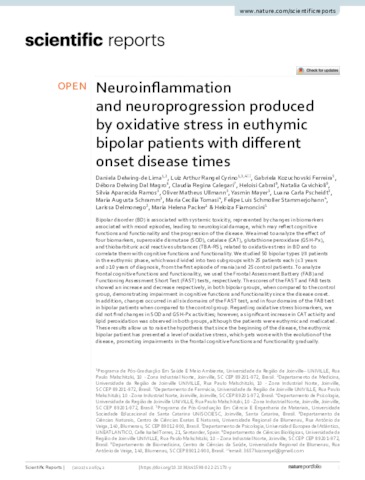 Lima, Daniela Delwing-de and Cyrino, Luiz Arthur Rangel and Ferreira, Gabriela Kozuchovski and Magro, Débora Delwing Dal and Calegari, Claudia Regina and Cabral, Heloisi and Cavichioli, Natalia and Ramos, Silvia Aparecida and Ullmann, Oliver Matheus and Mayer, Yasmin and Pscheidt, Luana Carla and Schramm, Maria Augusta and Tomasi, Maria Cecília and Stammerjohann, Felipe Luis Schmoller and Delmonego, Larissa and Packer, Maria Helena and Fiamoncini, Heloiza UNSPECIFIED (2022) Neuroinflammation and neuroprogression produced by oxidative stress in euthymic bipolar patients with different onset disease times. Scientific Reports, 12 (1). ISSN 2045-2322
