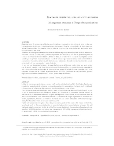 Carmona Campo, Carlos Javier UNSPECIFIED (2015) Procesos de gestión en las organizaciones solidarias. Revista ADGNOSIS, 4 (4). ISSN 2344-7516