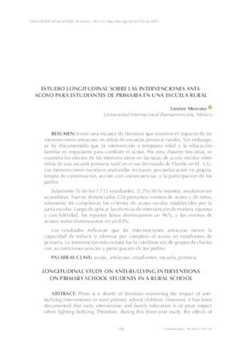 Moscoso, Laraine UNSPECIFIED (2022) Estudio longitudinal sobre las intervenciones antiacoso para estudiantes de primaria en una escuela rural. Contextos Educativos. Revista de Educación (30). pp. 195-210. ISSN 1575-023X