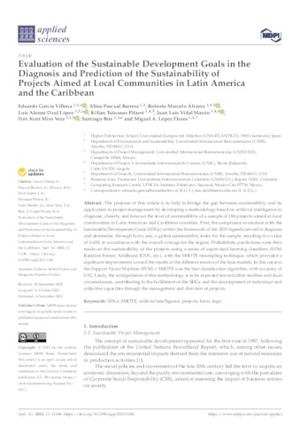 García Villena, Eduardo and Pascual Barrera, Alina Eugenia and Álvarez, Roberto Marcelo and Dzul López, Luis Alonso and Tutusaus, Kilian and Vidal Mazón, Juan Luis and Miró Vera, Yini Airet and Brie, Santiago and López Flores, Miguel A. eduardo.garcia@uneatlantico.es, alina.pascual@unini.edu.mx, roberto.alvarez@uneatlantico.es, luis.dzul@uneatlantico.es, kilian.tutusaus@uneatlantico.es, juanluis.vidal@uneatlantico.es, yini.miro@uneatlantico.es, santiago.brie@uneatlantico.es, miguelangel.lopez@uneatlantico.es (2022) Evaluation of the Sustainable Development Goals in the Diagnosis and Prediction of the Sustainability of Projects Aimed at Local Communities in Latin America and the Caribbean. Applied Sciences, 12 (21). p. 11188. ISSN 2076-3417