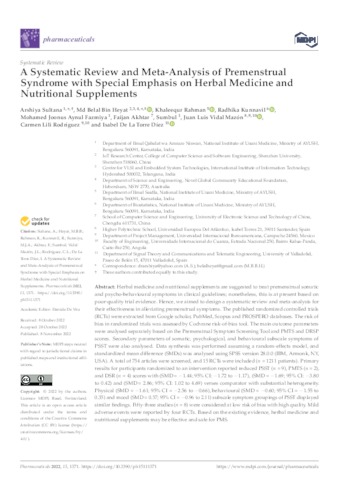 Sultana, Arshiya and Heyat, Md Belal Bin and Rahman, Khaleequr and Kunnavil, Radhika and Fazmiya, Mohamed Joonus Aynul and Akhtar, Faijan and Sumbul, X. and Vidal Mazón, Juan Luis and Rodríguez Velasco, Carmen Lilí and De La Torre Díez, Isabel UNSPECIFIED, UNSPECIFIED, UNSPECIFIED, UNSPECIFIED, UNSPECIFIED, UNSPECIFIED, UNSPECIFIED, juanluis.vidal@uneatlantico.es, carmen.rodriguez@uneatlantico.es, UNSPECIFIED (2022) A Systematic Review and Meta-Analysis of Premenstrual Syndrome with Special Emphasis on Herbal Medicine and Nutritional Supplements. Pharmaceuticals, 15 (11). p. 1371. ISSN 1424-8247