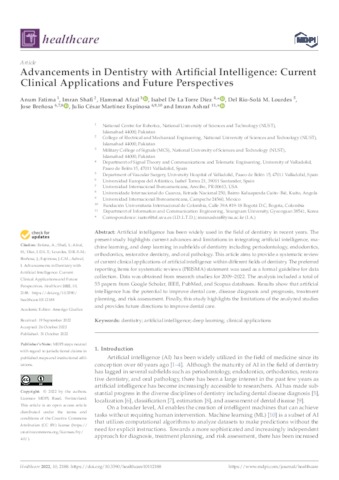 Fatima, Anum and Shafi, Imran and Afzal, Hammad and Díez, Isabel De La Torre and Lourdes, Del Rio-Solá M. and Breñosa, Jose and Martínez Espinosa, Julio César and Ashraf, Imran UNSPECIFIED, UNSPECIFIED, UNSPECIFIED, UNSPECIFIED, UNSPECIFIED, josemanuel.brenosa@uneatlantico.es, ulio.martinez@unini.edu.mx, UNSPECIFIED (2022) Advancements in Dentistry with Artificial Intelligence: Current Clinical Applications and Future Perspectives. Healthcare, 10 (11). p. 2188. ISSN 2227-9032