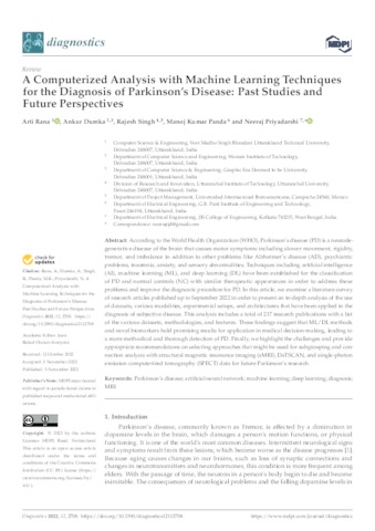Rana, Arti and Dumka, Ankur and Singh, Rajesh and Panda, Manoj Kumar and Priyadarshi, Neeraj UNSPECIFIED (2022) A Computerized Analysis with Machine Learning Techniques for the Diagnosis of Parkinson’s Disease: Past Studies and Future Perspectives. Diagnostics, 12 (11). p. 2708. ISSN 2075-4418