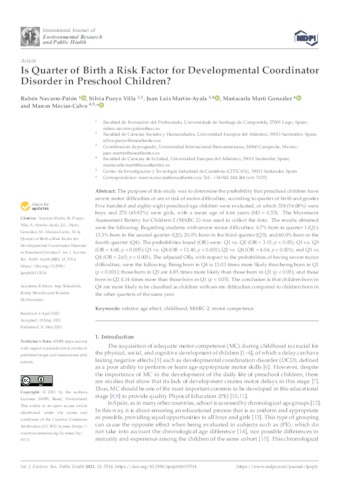 Navarro-Patón, Rubén and Pueyo Villa, Silvia and Martín Ayala, Juan Luis and Martí González, Mariacarla and Mecías-Calvo, Marcos UNSPECIFIED, silvia.pueyo@uneatlantico.es, juan.martin@uneatlantico.es, mariacarla.marti@uneatlantico.es, marcos.mecias@uneatlantico.es (2021) Is Quarter of Birth a Risk Factor for Developmental Coordinator Disorder in Preschool Children? International Journal of Environmental Research and Public Health, 18 (11). p. 5514. ISSN 1660-4601