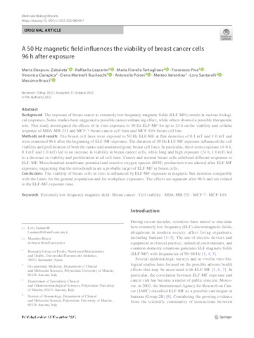 Elexpuru Zabaleta, Maria and Lazzarini, Raffaella and Tartaglione, Maria Fiorella and Piva, Francesco and Ciarapica, Veronica and Marinelli Busilacchi, Elena and Poloni, Antonella and Valentino, Matteo and Santarelli, Lory and Bracci, Massimo maria.elexpuru@uneatlantico.es, UNSPECIFIED, UNSPECIFIED, UNSPECIFIED, UNSPECIFIED, UNSPECIFIED, UNSPECIFIED, UNSPECIFIED, UNSPECIFIED, UNSPECIFIED (2023) A 50 Hz magnetic field influences the viability of breast cancer cells 96 h after exposure. Molecular Biology Reports. ISSN 0301-4851