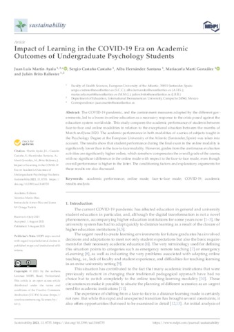 Martín Ayala, Juan Luis and Castaño Castaño, Sergio and Hernández Santana, Alba and Martí González, Mariacarla and Brito Ballester, Julién juan.martin@uneatlantico.es, sergio.castano@uneatlantico.es, alba.hernandez@uneatlantico.es, mariacarla.marti@uneatlantico.es, julien.brito@uneatlantico.es (2021) Impact of Learning in the COVID-19 Era on Academic Outcomes of Undergraduate Psychology Students. Sustainability, 13 (16). p. 8735. ISSN 2071-1050