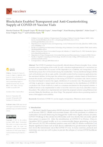 Chauhan, Harsha and Gupta, Deepali and Gupta, Sheifali and Singh, Aman and Aljahdali, Hani Moaiteq and Goyal, Nitin and Delgado Noya, Irene and Kadry, Seifedine UNSPECIFIED, UNSPECIFIED, UNSPECIFIED, UNSPECIFIED, UNSPECIFIED, UNSPECIFIED, irene.delgado@uneatlantico.es, UNSPECIFIED (2021) Blockchain Enabled Transparent and Anti-Counterfeiting Supply of COVID-19 Vaccine Vials. Vaccines, 9 (11). p. 1239. ISSN 2076-393X