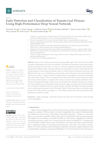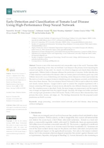 Trivedi, Naresh K. and Gautam, Vinay and Anand, Abhineet and Aljahdali, Hani Moaiteq and Gracia Villar, Santos and Anand, Divya and Goyal, Nitin and Kadry, Seifedine UNSPECIFIED, UNSPECIFIED, UNSPECIFIED, UNSPECIFIED, santos.gracia@uneatlantico.es, UNSPECIFIED, UNSPECIFIED, UNSPECIFIED (2021) Early Detection and Classification of Tomato Leaf Disease Using High-Performance Deep Neural Network. Sensors, 21 (23). p. 7987. ISSN 1424-8220
