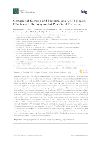 Perales, María and Valenzuela, Pedro L. and Barakat, Ruben and Cordero, Yaiza and Peláez, Mireia and López, Carmen and Ruilope, Luis M. and Santos-Lozano, Alejandro and Lucia, Alejandro UNSPECIFIED, UNSPECIFIED, UNSPECIFIED, UNSPECIFIED, mireia.pelaez@uneatlantico.es, UNSPECIFIED, UNSPECIFIED, UNSPECIFIED, UNSPECIFIED (2020) Gestational Exercise and Maternal and Child Health: Effects until Delivery and at Post-Natal Follow-up. Journal of Clinical Medicine, 9 (2). p. 379. ISSN 2077-0383