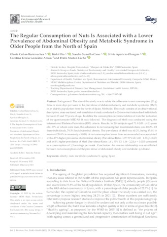 Cubas-Basterrechea, Gloria and Elío Pascual, Iñaki and Sumalla Cano, Sandra and Aparicio Obregón, Silvia and González-Antón, Carolina Teresa and Muñoz-Cacho, Pedro UNSPECIFIED, inaki.elio@uneatlantico.es, sandra.sumalla@uneatlantico.es, silvia.aparicio@uneatlantico.es, UNSPECIFIED, UNSPECIFIED (2022) The Regular Consumption of Nuts Is Associated with a Lower Prevalence of Abdominal Obesity and Metabolic Syndrome in Older People from the North of Spain. International Journal of Environmental Research and Public Health, 19 (3). p. 1256. ISSN 1660-4601