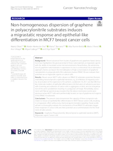 Diban, Nazely and Mantecón-Oria, Marián and Berciano, María T. and Puente-Bedia, Alba and Rivero, María J. and Urtiaga, Ane and Lafarga, Miguel and Tapia Martínez, Olga UNSPECIFIED, UNSPECIFIED, UNSPECIFIED, UNSPECIFIED, UNSPECIFIED, UNSPECIFIED, UNSPECIFIED, olga.tapia@uneatlantico.es (2022) Non-homogeneous dispersion of graphene in polyacrylonitrile substrates induces a migrastatic response and epithelial-like differentiation in MCF7 breast cancer cells. Cancer Nanotechnology, 13 (1). ISSN 1868-6958