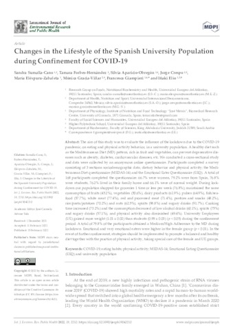 Sumalla Cano, Sandra and Forbes-Hernández, Tamara and Aparicio-Obregón, Silvia and Crespo-Álvarez, Jorge and Elexpuru Zabaleta, Maria and Gracia Villar, Mónica and Giampieri, Francesca and Elío Pascual, Iñaki sandra.sumalla@uneatlantico.es, UNSPECIFIED, silvia.aparicio@uneatlantico.es, jorge.crespo@uneatlantico.es, maria.elexpuru@uneatlantico.es, monica.gracia@uneatlantico.es, francesca.giampieri@uneatlantico.es, inaki.elio@uneatlantico.es (2022) Changes in the Lifestyle of the Spanish University Population during Confinement for COVID-19. International Journal of Environmental Research and Public Health, 19 (4). p. 2210. ISSN 1660-4601