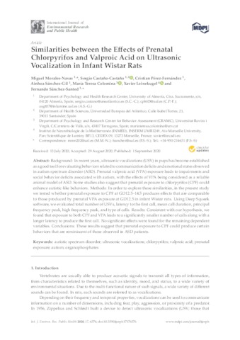 Morales-Navas, Miguel and Castaño-Castaño, Sergio and Pérez-Fernández, Cristian and Sánchez-Gil, Ainhoa and Teresa Colomina, María and Leinekugel, Xavier and Sánchez-Santed, Fernando UNSPECIFIED, sergio.castano@uneatlantico.es, UNSPECIFIED, UNSPECIFIED, UNSPECIFIED, UNSPECIFIED, UNSPECIFIED (2020) Similarities between the Effects of Prenatal Chlorpyrifos and Valproic Acid on Ultrasonic Vocalization in Infant Wistar Rats. International Journal of Environmental Research and Public Health, 17 (17). p. 6376. ISSN 1660-4601