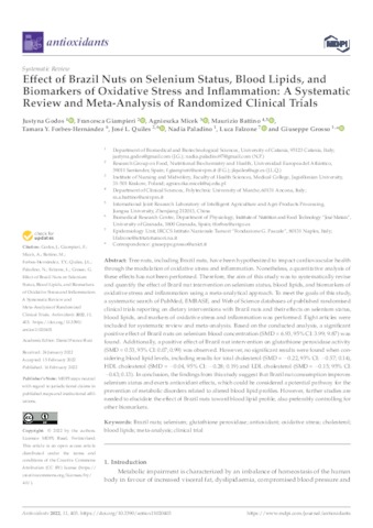 Godos, Justyna and Giampieri, Francesca and Micek, Agnieszka and Battino, Maurizio and Forbes-Hernández, Tamara Y. and Quiles, José L. and Paladino, Nadia and Falzone, Luca and Grosso, Giuseppe UNSPECIFIED, francesca.giampieri@uneatlantico.es, UNSPECIFIED, maurizio.battino@uneatlantico.es, UNSPECIFIED, jose.quiles@uneatlantico.es, UNSPECIFIED, UNSPECIFIED, UNSPECIFIED (2022) Effect of Brazil Nuts on Selenium Status, Blood Lipids, and Biomarkers of Oxidative Stress and Inflammation: A Systematic Review and Meta-Analysis of Randomized Clinical Trials. Antioxidants, 11 (2). p. 403. ISSN 2076-3921