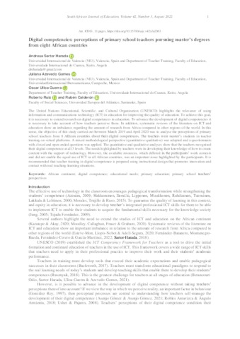 Sartor-Harada, Andresa and Azevedo-Gomes, Juliana and Ulloa-Guerra, Oscar and Ruiz Salces, Roberto and Calderón Iglesias, Rubén andresa.sartor@uneatlantico.es, juliana.azevedo@uneatlantico.es, oscar.ulloa@uneatlantico.es, roberto.ruiz@uneatlantico.es, ruben.calderon@uneatlantico.es (2022) Digital competencies: perceptions of primary school teachers pursuing master’s degrees from eight African countries. SA Journal of Education, 42 (3). ISSN 2076-3433