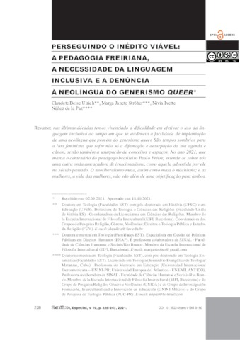 Ulrich, Claudete Beise and Ströher, Marga Janete and Núñez de la Paz, Nivia Ivette UNSPECIFIED (2021) Perseguindo o inédito viável: a pedagogia freiriana, a necesssidade da linguagem inclusiva e a denúncia à neolíngua do generismo queer. Revista Caminhos - Revista de Ciências da Religião, ESPECIAL,, 19. pp. 228-247. ISSN 1678-3034