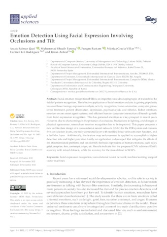 Qazi, Awais Salman and Farooq, Muhammad Shoaib and Rustam, Furqan and Gracia Villar, Mónica and Rodríguez Velasco, Carmen Lilí and Ashraf, Imran UNSPECIFIED, UNSPECIFIED, UNSPECIFIED, monica.gracia@uneatlantico.es, carmen.rodriguez@uneatlantico.es, UNSPECIFIED (2022) Emotion Detection Using Facial Expression Involving Occlusions and Tilt. Applied Sciences, 12 (22). p. 11797. ISSN 2076-3417