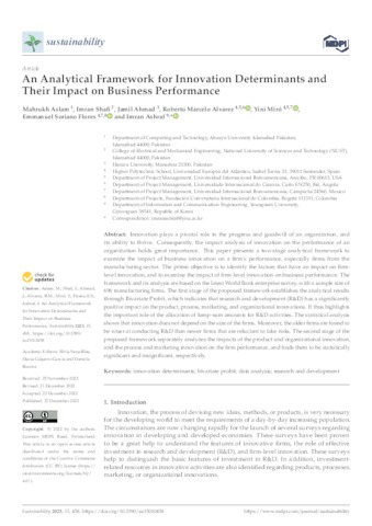 Aslam, Mahrukh and Shafi, Imran and Ahmad, Jamil and Álvarez, Roberto Marcelo and Miró Vera, Yini Airet and Soriano Flores, Emmanuel and Ashraf, Imran UNSPECIFIED, UNSPECIFIED, UNSPECIFIED, roberto.alvarez@uneatlantico.es, yini.miro@uneatlantico.es, emmanuel.soriano@uneatlantico.es, UNSPECIFIED (2022) An Analytical Framework for Innovation Determinants and Their Impact on Business Performance. Sustainability, 15 (1). p. 458. ISSN 2071-1050