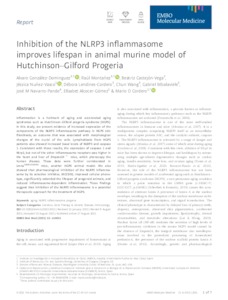 González‐Dominguez, Alvaro and Montañez, Raúl and Castejón‐Vega, Beatriz and Nuñez‐Vasco, Jéssica and Lendines‐Cordero, Débora and Wang, Chun and Mbalaviele, Gabriel and Navarro-Pando, José Manuel and Alcocer‐Gómez, Elísabet and Cordero, Mario D UNSPECIFIED, UNSPECIFIED, UNSPECIFIED, UNSPECIFIED, UNSPECIFIED, UNSPECIFIED, UNSPECIFIED, jose.navarro@uneatlantico.es, UNSPECIFIED, UNSPECIFIED (2021) Inhibition of the NLRP3 inflammasome improves lifespan in animal murine model of Hutchinson–Gilford Progeria. EMBO Molecular Medicine, 13 (10). ISSN 1757-4676