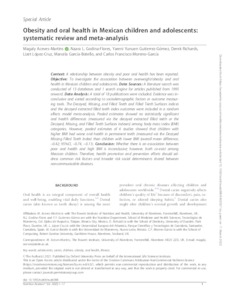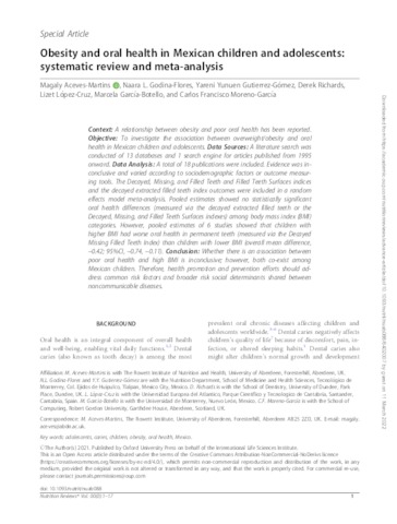 Aceves-Martins, Magaly and Godina-Flores, Naara L and Gutierrez-Gómez, Yareni Yunuen and Richards, Derek and López-Cruz, Lizet and García-Botello, Marcela and Moreno-García, Carlos Francisco UNSPECIFIED (2021) Obesity and oral health in Mexican children and adolescents: systematic review and meta-analysis. Nutrition Reviews. ISSN 0029-6643