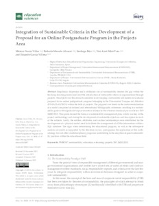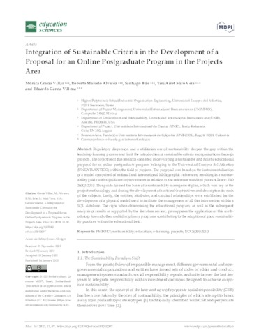Gracia Villar, Mónica and Álvarez, Roberto Marcelo and Brie, Santiago and Miró Vera, Yini Airet and García Villena, Eduardo monica.gracia@uneatlantico.es, roberto.alvarez@uneatlantico.es, santiago.brie@uneatlantico.es, yini.miro@uneatlantico.es, eduardo.garcia@uneatlantico.es (2023) Integration of Sustainable Criteria in the Development of a Proposal for an Online Postgraduate Program in the Projects Area. Education Sciences, 13 (1). p. 97. ISSN 2227-7102