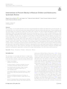 The prevalence of overweight and obesity has been rising among Mexican children and adolescents in the last decades. To systematically review obesity prevention interventions delivered to Mexican children and adolescents. Thirteen databases and one search engine were searched for evidence from 1995 to 2021. Searches were done in English and Spanish to capture relevant information. Studies with experimental designs, delivered in any setting (e.g., schools or clinics) or digital domains (e.g., social media campaigns) targeting Mexican children or adolescents (≤ 18 years) and reporting weight outcomes, were included in this review. In addition, the risk of bias was appraised with the Effective Public Health Practice Project Quality Assessment Tool. Twenty-nine studies with 19,136 participants (3-17 years old) were included. The prevalence of overweight and obesity at baseline ranged from 21 to 69%. Most of the studies (89.6%) were delivered in school settings. The duration ranged from 2 days to 3 school years, and the number of sessions also varied from 2 to 200 sessions at different intensities. Overall, anthropometric changes varied across studies. Thus, the efficacy of the included studies is heterogeneous and inconclusive among studies. Current evidence is heterogeneous and inconclusive about the efficacy of interventions to prevent obesity in Mexican children and adolescents. Interventions should not be limited to educational activities and should include different components, such as multi-settings delivery, family inclusion, and longer-term implementations. Mixed-method evaluations (including robust quantitative and qualitative approaches) could provide a deeper understanding of the effectiveness and best practices.