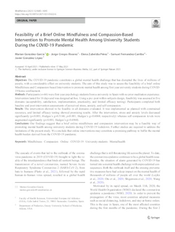 González-García, Marian and Crespo-Álvarez, Jorge and Zubeldia Pérez, Elena and Fernandez-Carriba, Samuel and González López, Javier marian.gonzalez@uneatlantico.es, jorge.crespo@uneatlantico.es, UNSPECIFIED, UNSPECIFIED, UNSPECIFIED (2021) Feasibility of a Brief Online Mindfulness and Compassion-Based Intervention to Promote Mental Health Among University Students During the COVID-19 Pandemic. Mindfulness, 12 (7). pp. 1685-1695. ISSN 1868-8527