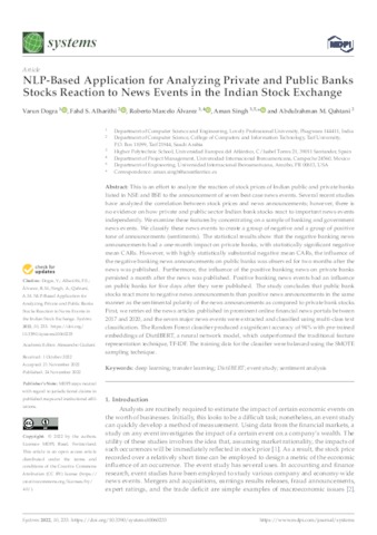 Dogra, Varun and Alharithi, Fahd S. and Álvarez, Roberto Marcelo and Singh, Aman and Qahtani, Abdulrahman M. UNSPECIFIED, UNSPECIFIED, roberto.alvarez@uneatlantico.es, aman.singh@uneatlantico.es, UNSPECIFIED (2022) NLP-Based Application for Analyzing Private and Public Banks Stocks Reaction to News Events in the Indian Stock Exchange. Systems, 10 (6). p. 233. ISSN 2079-8954