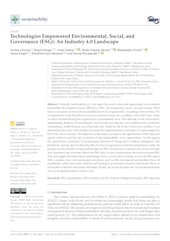 Saxena, Archana and Singh, Rajesh and Gehlot, Anita and Akram, Shaik Vaseem and Twala, Bhekisipho and Singh, Aman and Caro Montero, Elisabeth and Priyadarshi, Neeraj UNSPECIFIED, UNSPECIFIED, UNSPECIFIED, UNSPECIFIED, UNSPECIFIED, aman.singh@uneatlantico.es, elizabeth.caro@uneatlantico.es, UNSPECIFIED (2022) Technologies Empowered Environmental, Social, and Governance (ESG): An Industry 4.0 Landscape. Sustainability, 15 (1). p. 309. ISSN 2071-1050