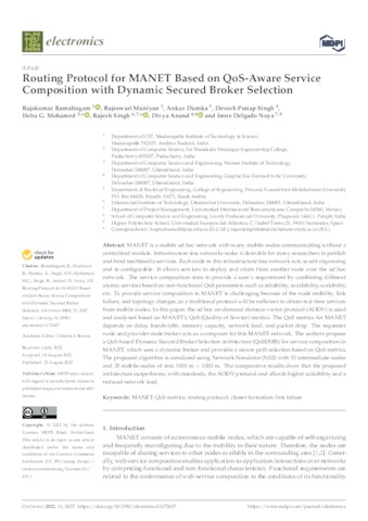Ramalingam, Rajakumar and Muniyan, Rajeswari and Dumka, Ankur and Singh, Devesh Pratap and Mohamed, Heba G. and Singh, Rajesh and Anand, Divya and Delgado Noya, Irene UNSPECIFIED, UNSPECIFIED, UNSPECIFIED, UNSPECIFIED, UNSPECIFIED, UNSPECIFIED, divya.anand@uneatlantico.es, irene.delgado@uneatlantico.es (2022) Routing Protocol for MANET Based on QoS-Aware Service Composition with Dynamic Secured Broker Selection. Electronics, 11 (17). p. 2637. ISSN 2079-9292