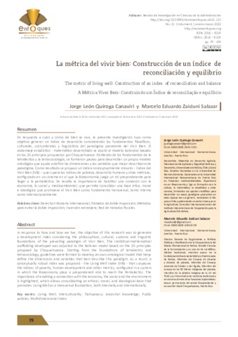 Quiroga Canaviri, Jorge León and Zaiduni Salazar, Marcelo Eduardo UNSPECIFIED (2022) La métrica del vivir bien: Construcción de un índice de reconciliación y equilibrio. Revista Enfoques, 6 (21). pp. 79-105. ISSN 2616-8219