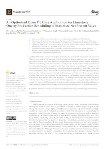 Joshi, Devendra and Chithaluru, Premkumar and Singh, Aman and Yadav, Arvind and Elkamchouchi, Dalia H. and Breñosa, Jose and Anand, Divya UNSPECIFIED, UNSPECIFIED, aman.singh@uneatlantico.es, UNSPECIFIED, UNSPECIFIED, josemanuel.brenosa@uneatlantico.es, divya.anand@uneatlantico.es (2022) An Optimized Open Pit Mine Application for Limestone Quarry Production Scheduling to Maximize Net Present Value. Mathematics, 10 (21). p. 4140. ISSN 2227-7390