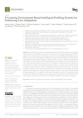 Kaur, Ramneet and Gupta, Deepali and Madhukar, Mani and Singh, Aman and Abdelhaq, Maha and Alsaqour, Raed and Breñosa, Jose and Goyal, Nitin UNSPECIFIED, UNSPECIFIED, UNSPECIFIED, aman.singh@uneatlantico.es, UNSPECIFIED, UNSPECIFIED, josemanuel.brenosa@uneatlantico.es, UNSPECIFIED (2022) E-Learning Environment Based Intelligent Profiling System for Enhancing User Adaptation. Electronics, 11 (20). p. 3354. ISSN 2079-9292