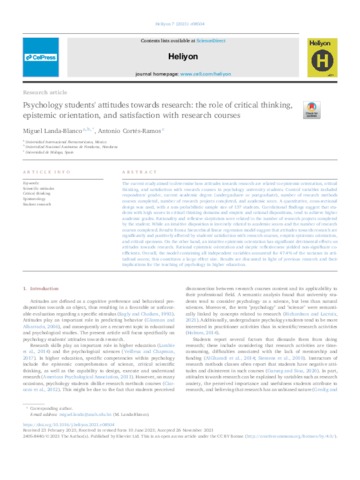 Landa-Blanco, Miguel and Cortés-Ramos, Antonio UNSPECIFIED (2021) Psychology students' attitudes towards research: the role of critical thinking, epistemic orientation, and satisfaction with research courses. Heliyon, 7 (12). e08504. ISSN 24058440