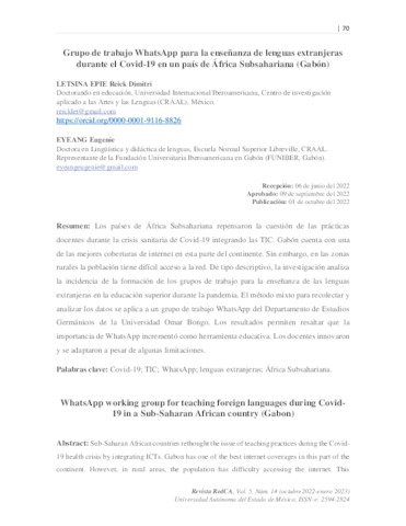 Eyeang, Eugénie and Letsina-Epie, Reick Dimitri eugenie.eyeang@unini.edu.mx, UNSPECIFIED (2022) Grupo de trabajo WhatsApp para la enseñanza de lenguas extranjeras durante el Covid-19 en un país de África Subsahariana (Gabón). Revista RedCA, 5 (14). p. 70. ISSN 2594-2824