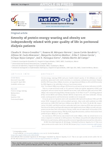 Orozco González, Nelly and Márquez-Herrera, Roxana M. and Cortés-Sanabria, Laura and Cueto-Manzano, Alfonso M. and Gutiérrez-Medina, Margarita and Gómez-García, Erika F. and Rojas-Campos, Enrique and Paniagua-Sierra, José R. and Martín del Campo, Fabiola nelly.orozco@unini.edu.mx, UNSPECIFIED, UNSPECIFIED, UNSPECIFIED, UNSPECIFIED, UNSPECIFIED, UNSPECIFIED, UNSPECIFIED, UNSPECIFIED (2021) Severity of protein-energy wasting and obesity are independently related with poor quality of life in peritoneal dialysis patients. Nefrología. ISSN 02116995