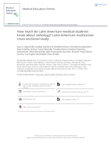 Izquierdo Condoy, Juan Sebastian and Simbaña-Rivera, Katherine and Nati-Castillo, Humberto Alejandro and Cassa Macedo, Arthur and Cardozo Espínola, Claudia Diana and Vidal Barazorda, Gabriela M. and Palazuelos-Guzmán, Ideli and Trejo García, Brayan and Carrington, Sarah J. and Ortiz-Prado, Esteban UNSPECIFIED (2023) How much do Latin American medical students know about radiology? Latin-American multicenter cross-sectional study. Medical Education Online, 28 (1). ISSN 1087-2981