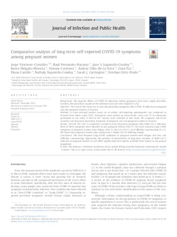 Vásconez-González, Jorge and Fernandez-Naranjo, Raul and Izquierdo Condoy, Juan Sebastian and Delgado-Moreira, Karen and Cordovez, Simone and Tello-De-la-Torre, Andrea and Paz, Clara and Castillo, Diana and Izquierdo-Condoy, Nathaly and Carrington, Sarah J. and Ortiz-Prado, Esteban UNSPECIFIED (2023) Comparative analysis of long-term self-reported COVID-19 symptoms among pregnant women. Journal of Infection and Public Health, 16 (3). pp. 430-440. ISSN 18760341