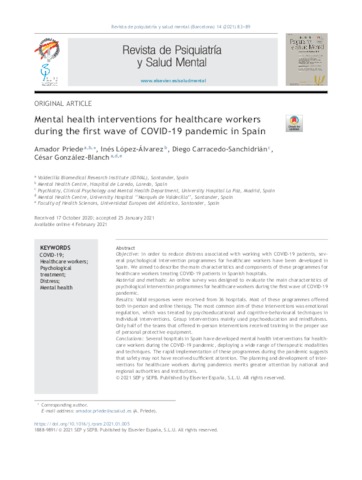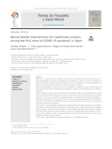 Priede, Amador and López-Álvarez, Inés and Carracedo-Sanchidrián, Diego and González-Blanch, César UNSPECIFIED, UNSPECIFIED, UNSPECIFIED, cesar.gonzalezblanch@uneatlantico.es (2021) Intervenciones de salud mental para trabajadores sanitarios durante la primera ola de la pandemia de COVID-19 en España. Revista de Psiquiatría y Salud Mental, 14 (2). pp. 83-89. ISSN 18889891