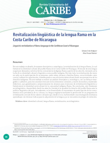 Hodgson, Selvano Ervin and Pascual Barrera, Alina Eugenia UNSPECIFIED, alina.pascual@unini.edu.mx (2022) Revitalización lingüística de la lengua Rama en la Costa Caribe de Nicaragua. Revista Universitaria del Caribe, 29 (02). pp. 86-95. ISSN 2311-5807