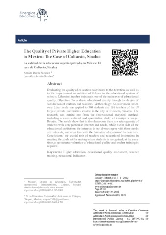 Ibarra-Sánchez, Alfredo and Acuña Gamboa, Luis Alan UNSPECIFIED (2022) The Quality of Private Higher Education in Mexico: The Case of Culiacán, Sinaloa. Sinergias Educativas, 7 (1).