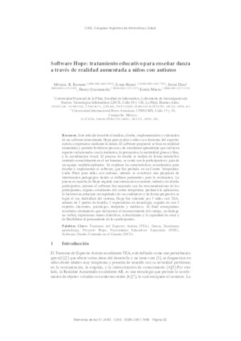 Romero, Mónica R and Harari, Ivana and Diaz, Javier and Quisnancela, Henry and Macas Ruiz, Estela María UNSPECIFIED (2022) Software Hope: tratamiento educativo para enseñar danza a través de realidad aumentada a niños con autismo. Memorias de las JAIIO, 8 (5). pp. 52-63.