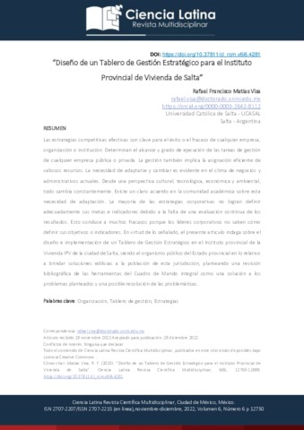 Matias Visa, Rafael Francisco UNSPECIFIED (2023) Diseño de un Tablero de Gestión Estratégico para el Instituto Provincial de Vivienda de Salta. Ciencia Latina Revista Científica Multidisciplinar, 6 (6). pp. 12750-12698. ISSN 2707-2207