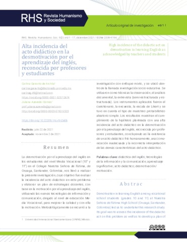 Garavito de Archila, Carlina and Azevedo-Gomes, Juliana UNSPECIFIED, juliana.azevedo@uneatlantico.es (2021) Alta incidencia del acto didáctico en la desmotivación por el aprendizaje del inglés, reconocida por profesores y estudiantes. RHS-Revista Humanismo y Sociedad, 9 (2). pp. 1-17. ISSN 23394196
