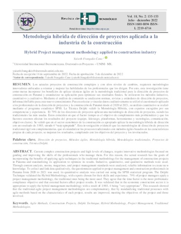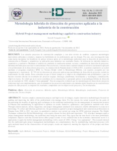 Los actuales proyectos de construcción complejos y con altos niveles de cambios, requieren metodologías innovadoras enfocadas a orientar y mejorar las habilidades de los profesionales que los dirigen. Por esto, esta investigación tiene como metas incorporar los beneficios de aplicar técnicas ágiles en la metodología tradicional para la dirección de proyectos de construcción en Panamá y estandarizar su aplicación para optimizar sus resultados finales. Se utilizaron los métodos inductivo, cuantitativo y cualitativo. Mediante el análisis de contenido se analizaron normas, revistas y estándares de dirección de proyectos, información fiable para crear nuevo conocimiento. Para recolectar y vincular datos cualitativamente se utilizó el cuestionario aplicado a los profesionales de la dirección de proyectos y la construcción de Panamá desde el 2020 al 2021, su análisis cuantitativo se realizó mediante el programa estadístico SPSS. La Técnica Delphi validó la Metodología Híbrida, con expertos escogidos por sus competencias y experiencia. El 79% de los directores de proyectos aplican una metodología de dirección de proyectos, siendo las tradicionales las más usadas. Estos coinciden en que el factor tiempo es el objetivo de cumplimiento más problemático y que los factores externos afectan los resultados del proyecto (equipo, liderazgo, plataformas, herramientas y tecnologías, comunicación, objetivos claros). Se validó que en el sector económico de la construcción es apropiado aplicar la metodología híbrida de dirección con un resultado de 3.903, siendo 4 “muy apropiado”. Esta investigación evidenció que las metodologías de dirección de proyectos tradicional-ágil son complementarias, que al estandarizar los procesos tradicionales con métodos ágiles basados en las características propias de cada proyecto, se mejoran los resultados, cumpliendo con los objetivos del proyecto y los involucrados