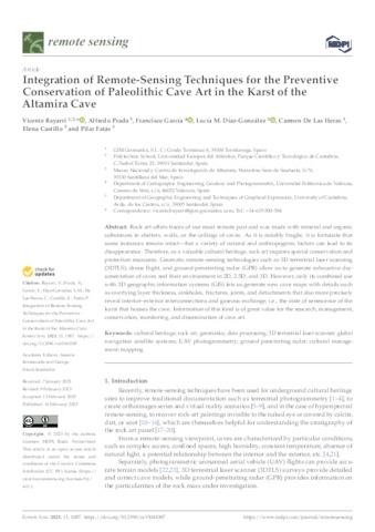 Bayarri Cayón, Vicente and Prada, Alfredo and García, Francisco and Díaz-González, Lucía M. and De Las Heras, Carmen and Castillo, Elena and Fatás, Pilar vicente.bayarri@uneatlantico.es, UNSPECIFIED, UNSPECIFIED, UNSPECIFIED, UNSPECIFIED, UNSPECIFIED, UNSPECIFIED (2023) Integration of Remote-Sensing Techniques for the Preventive Conservation of Paleolithic Cave Art in the Karst of the Altamira Cave. Remote Sensing, 15 (4). p. 1087. ISSN 2072-4292