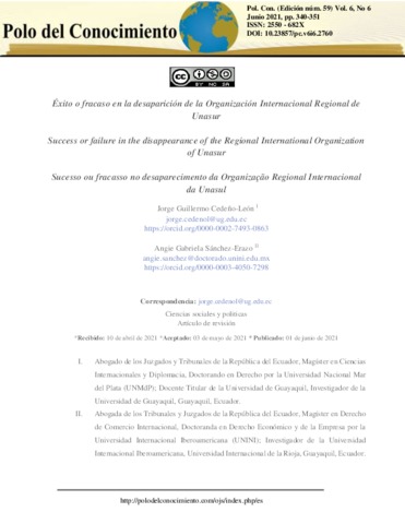 Sánchez Erazo, Angie Gabriela and Cedeño León, Jorge Guillermo UNSPECIFIED (2021) Éxito o fracaso en la desaparición de la Organización Internacional Regional de Unasur. Polo del Conocimiento: Revista cient\'\ifico-profesional, 6 (6). pp. 340-351.