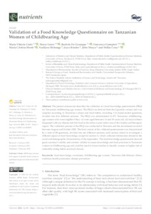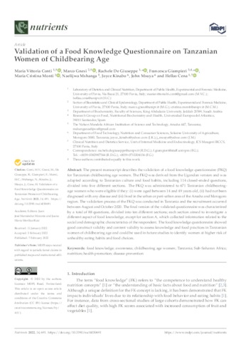 Conti, Maria Vittoria and Gnesi, Marco and De Giuseppe, Rachele and Giampieri, Francesca and Monti, Maria Cristina and Mshanga, Naelijwa and Kinabo, Joyce and Msuya, John and Cena, Hellas UNSPECIFIED, UNSPECIFIED, UNSPECIFIED, francesca.giampieri@uneatlantico.es, UNSPECIFIED, UNSPECIFIED, UNSPECIFIED, UNSPECIFIED, UNSPECIFIED (2022) Validation of a Food Knowledge Questionnaire on Tanzanian Women of Childbearing Age. Nutrients, 14 (3). p. 691. ISSN 2072-6643