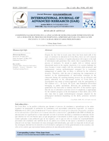 Jones Soutt, Vilma UNSPECIFIED (2021) Competencias docentes en la aplicación de estrategias de intervención de aula durante el proceso de enseñanza-aprendizaje para una educación inclusiva y con calidad: resultados preliminares. International Journal of Advanced Research, 9 (06). pp. 455-463. ISSN 23205407