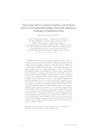 Rodríguez Velasco, Carmen Lilí and García Villena, Eduardo and Brito Ballester, Julién and Durántez Prados, Frigdiano Álvaro and Silva Alvarado, Eduardo René and Crespo Álvarez, Jorge carmen.rodriguez@uneatlantico.es, eduardo.garcia@uneatlantico.es, julien.brito@uneatlantico.es, durantez@uneatlantico.es, eduardo.silva@funiber.org, jorge.crespo@uneatlantico.es (2023) Forecasting of Post-Graduate Students’ Late Dropout Based on the Optimal Probability Threshold Adjustment Technique for Imbalanced Data. International Journal of Emerging Technologies in Learning (iJET), 18 (04). pp. 120-155. ISSN 1863-0383